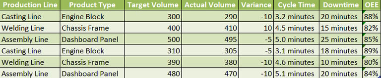 El reporte se enfoca en el volumen de producción (tanto objetivo como real), la eficiencia, los tiempos de inactividad y otras métricas clave que reflejan el desempeño de la producción.
